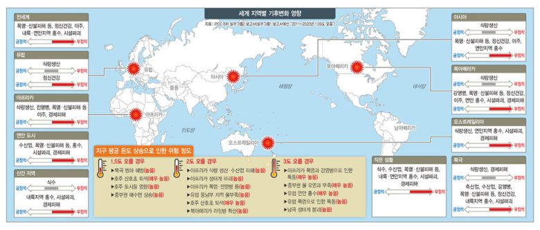 전세계 기후변화 상황도 보고서에 담겨있다. 팩트시트 확인 결과, 아시아에서는 물 부족, 폭염, 홍수 등의 위험이 예상됐다. 과학자들은 이번 세기말 지구온난화로 인해 아시아 전역의 가뭄이 5~20% 증가할 수 있고 아무다리야 강, 인더스 강, 갠지스 강 유역 등지 식량생산량이 높은 지역도 세기 중반부터 심각한 물 부족 문제에 직면할 수 있다고 봤다. 또 기온 상승으로 인해 폭염 위험이 전역에 걸쳐 증가하고, 서·중앙아시아, 남아시아 일부 지역에선 가뭄이, 동남아 몬순 지역에서는 홍수 가능성이 높아진다.
