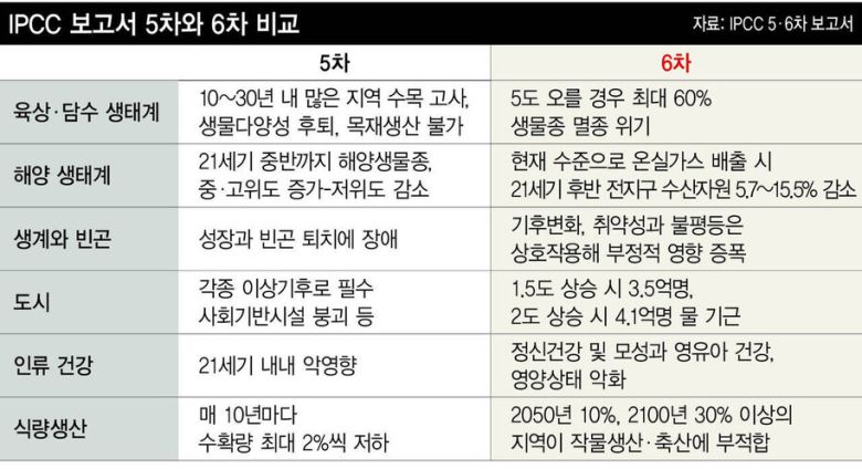아이피시시는 2014년 펴낸 5차 보고서(AR5)에서 인간 활동에 의한 기후변화가 심화되고 인간의 목숨과 사회 체계가 흔들리고 있다고 ‘경고’한 바 있다. 이번 6차 보고서에서는 보다 구체적으로 지역별 피해 예측과 예측 신뢰도를 높인 것이 특징이다. 5차 보고서에서 경고한 ‘폭우·폭염·홍수·가뭄·물부족’은 6차 보고서에서 지구 평균기온 산업화 이전보다 1.5도 더 상승할 시 3억5천만명, 2도 상승 시 4억1000만명의 도시인구가 물 부족에 내몰린단 전망으로 구체화했다. 또 모성과 영유아의 건강, 정신건강이 악화될 수 있다고 짚었다.