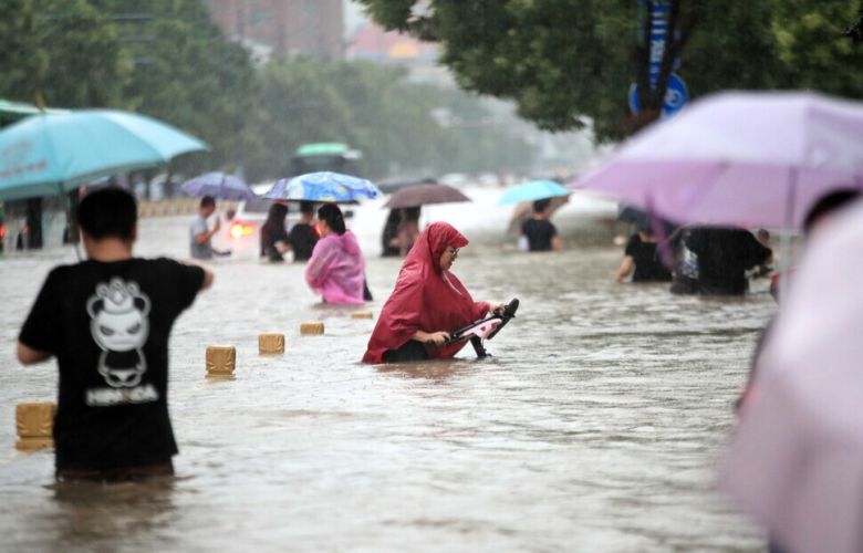 지난해 7월20일 중국 허난성 정저우에 폭우가 내려 잠긴 도로를 시민들이 지나가고 있다. 정저우/EPA 연합뉴스
