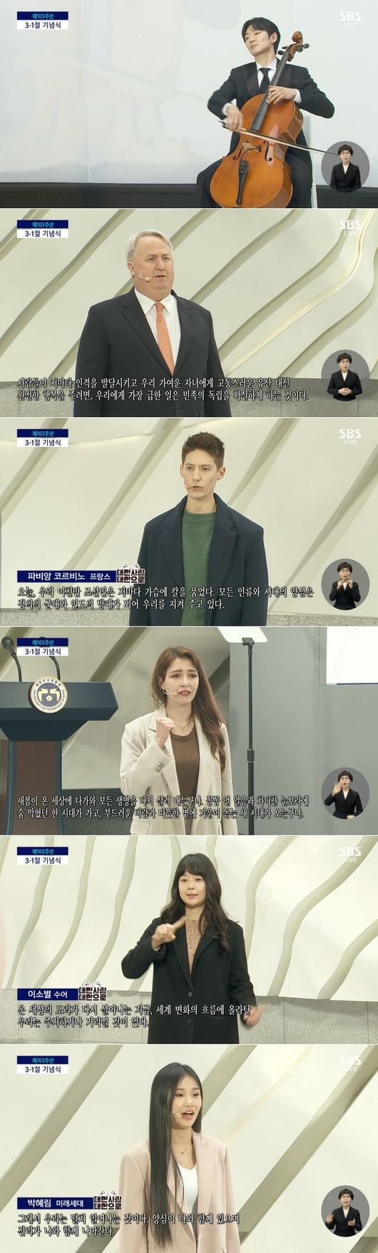 이 밖에도 배우 이소별이 수어로, 프랑스 출신 방송인 파비앙이 프랑스어로 독립선언서 낭독에 함께 했다. 이들은 JTBC 예능 프로그램 '슈퍼밴드'에도 출연했던 첼리스트 홍진호의 연주와 함께 항일음악 5곡 메들리, 한국행진곡,대한혼가, 압록강행진곡, 대니보이, 아리랑을 배경 삼아 낭독을 이어갔다.