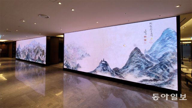 앰배서더서울풀만 호텔 로비에 설치된 이이남 작가의 ‘금강의 빛’. 전승훈 기자 raphy@donga.com |