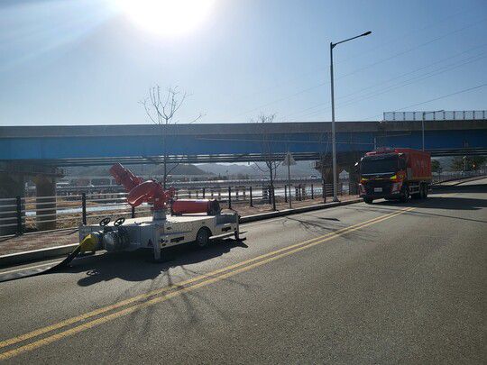 5일 오후 3시30분께 한국가스공사 삼척기지본부 월천리 방면 남단 도로에 분당 7만5000ℓ의 물을 방수할 수 있는 대용량 방사포가 설치돼있다. 고병찬 기자 |