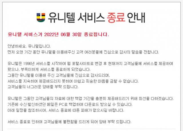 유니텔은 “서비스 종료에 앞서 고객 자료 백업 기간을 충분히 제공해드리기 위해 최선을 다하겠다”며 “기존 메일은 PC로 백업해 다운받을 수 있다”고 설명했다. 이어 “그동안 이용해 준 고객들에게 진심으로 감사드리며 서비스를 지속해 제공해드리지 못해 아쉽고 죄송한 마음을 금할 수 없다”며 “고객들의 너그러운 양해를 부탁드린다”고 했다.