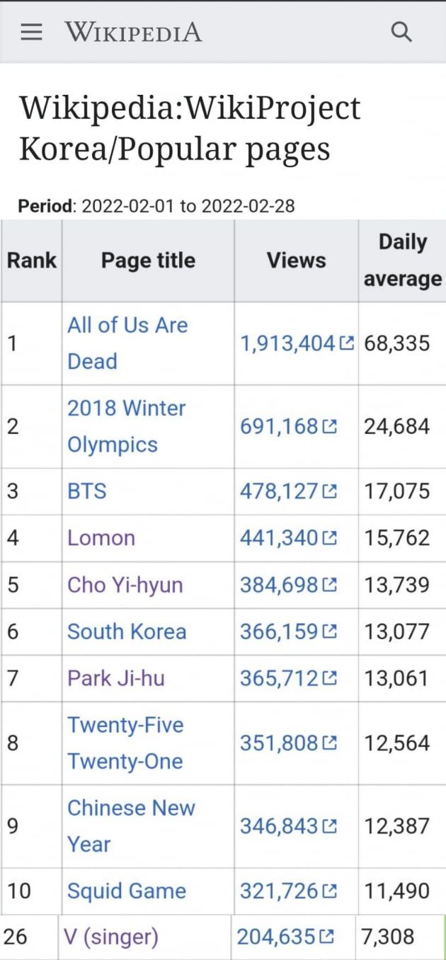 뷔는 2022년 2월 위키피디아 한국 프로젝트 페이지(영문판) 공식랭킹에서 총 20만 4,635건을 기록해 한국 솔로 아티스트 12개월 연속 1위에 올랐다.