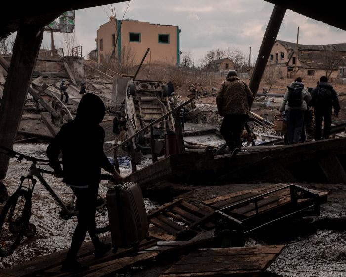 수천명의 주민들이 닷새 넘게 물과 전기, 음식 등이 끊긴 상황에서 버티다 탈출을 선택했다. 하지만 러시아군은 민간인들의 피난길에도 포탄을 쏟아부었다. 마르크쉰 시장은 “대피 첫날부터 기차에 포격이 이뤄졌고 둘째날에는 철도가 폭파됐다”고 전했다. 우크라이나군은 러시아군의 수도 진격을 막기 위해 외부와 통하는 다리를 끊어버렸다. 민간인들은 현지경찰의 안내에 따라 끊어진 다리 아래에 널판지로 만든 임시 통로로 탈출했다고 로이터통신은 전했다.