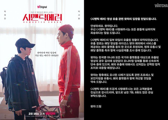 9일 국내 OTT 왓챠 측은 '시맨틱 에러' 일부 파일이 유출된 정황이 파악되었습니다. 유출 경로는 해당 영상을 라이선스 받아 해외에서 서비스를 제공하는 해외 플랫폼 중의 한 곳으로 추정되며, 현재 유통사 및 해당 플랫폼 측과 함께 사실관계를 조사 중에 있습니다"라고 공지했다.