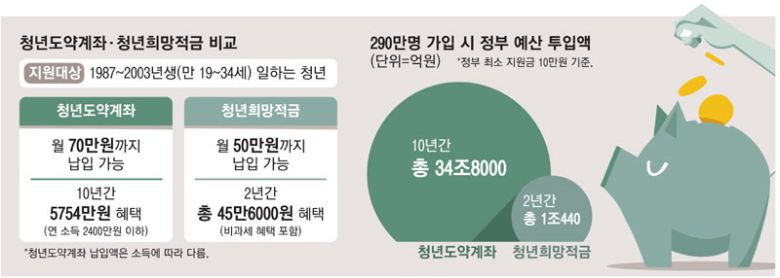 '대한민국 청년 10년간 1억원 만들기 통장'으로 불리는 이 상품에 가입하면 10년간 최대 5754만원의 혜택을 받을 수 있다. 청년희망적금에 가입한 290만명이 모두 이 상품으로 갈아탈 경우 10년간 정부가 부담할 금액은 최소 34조8000억원이 넘는다.