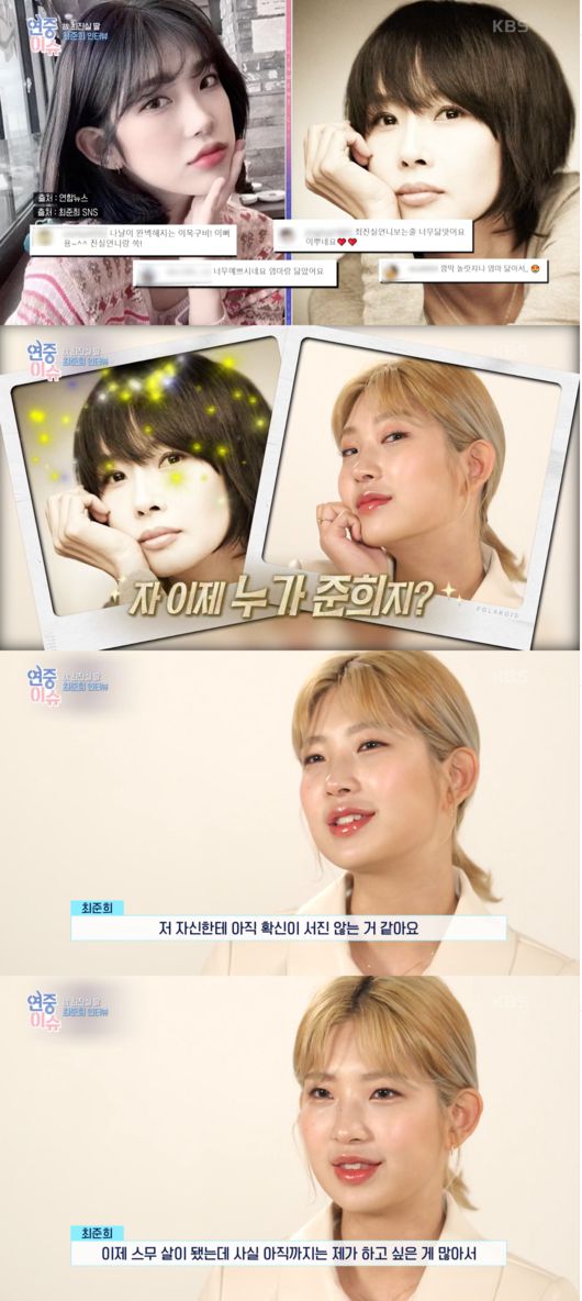 최준희는 “딸도 연기를 하는구나 생각하시는데 내 자신에게 확신이 서지 않는다”라며 카페, 애견미용 등 다양한 관심분야를 밝히며 “이제 스무 살이 됐는데 아직까지 하고 싶은 게 많아서 한 가지만 선택하기엔 아쉽더라”라고 했다.