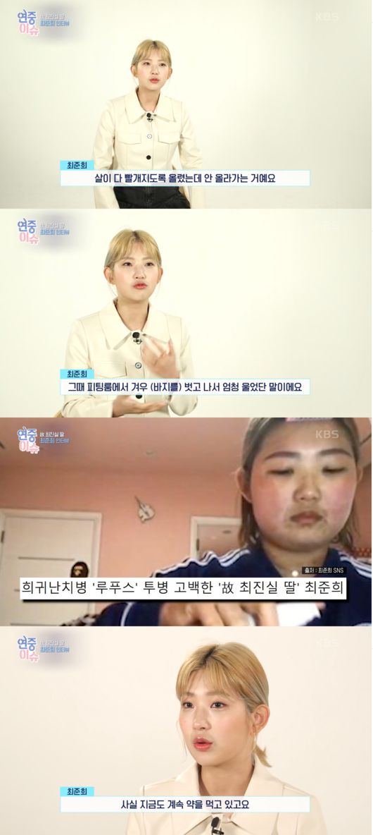 최준희가 살이 찐 이유는 루프스병 투병 때문이었다. 그는 “중학교 3학년 말 때 걸렸다. 완치가 없다. 지금도 약을 먹고 있다. 약 때문에 96kg까지 늘었다. 약 부작용 때문에 엄청 먹었다”고 했다.
