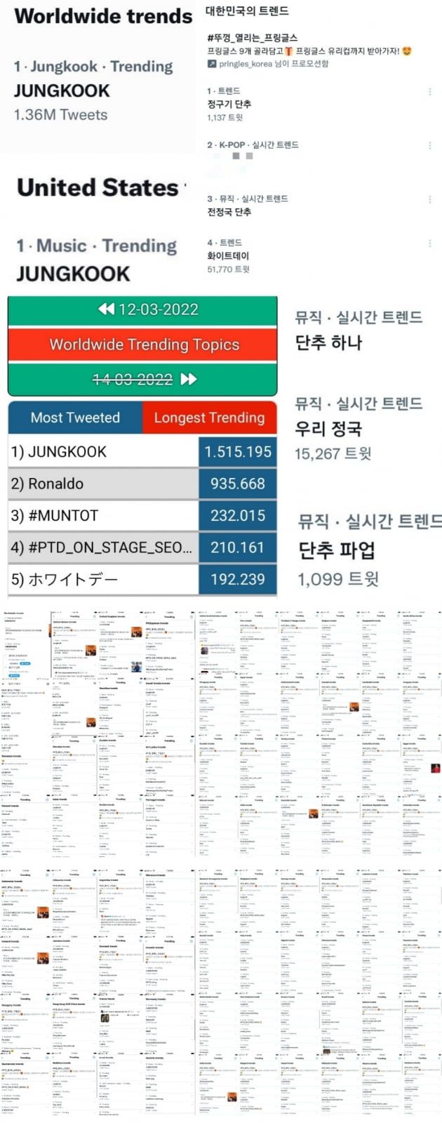 또 JUNGKOOK이 오후 8시경 150만 트윗량을 넘어섰고 '전정국 단추'가 한국 실시간 트렌드 3위, '단추 파업' '단추 하나' '우리 정국' 이 뮤직 실시간 트렌드에 올랐다.