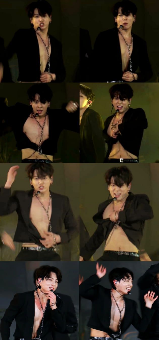 당일 정국은 '페이크 러브'(FAKE LOVE)에서 '내 모든 약점들은 다 숨겨지길~'의 격렬한 퍼포먼스를 펼치던 중 갑자기 단추가 터졌고 그 순간 땀으로 범벅된 잔뜩 성난 에잇팩과 탄탄한 가슴 근육이 그대로 노출되며 역대급 섹시미를 선사했다.