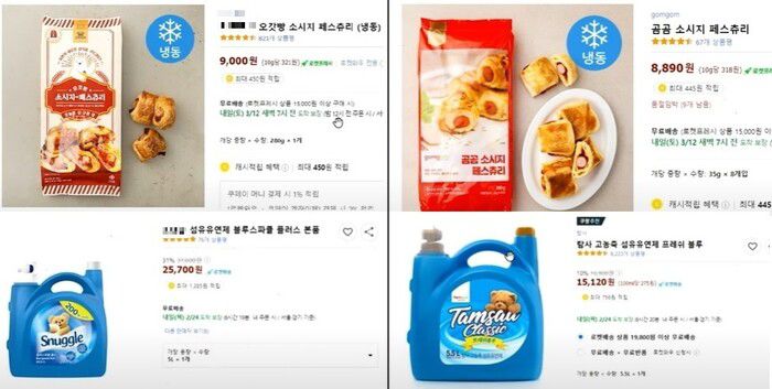 쿠팡 자체 브랜드 ‘곰곰’의 소시지 페이스트리 냉동 빵은 중소 제과업체의 소시지 페이스트리 빵과 포장과 제품 이미지까지 닮았다. 다만 쿠팡 브랜드 빵 가격이 10원 더 저렴해 최저가 검색을 하면 쿠팡 브랜드가 상위에 노출된다. 이밖에도 인기 보리 음료와 유사한 쿠팡의 곰곰 고소한 보리차, 인기 클렌징폼 제품과 비슷한 쿠팡 비타할로 클렌저 등 기존 제품을 본뜬 듯한 자체 브랜드 상품들이 더 싼 가격에 판매되고 있다.
