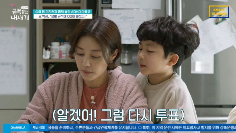 이날 방송에서 이지현의 가족은 '공동 생활규칙'을 정했다. 웬일로 금쪽이는 "엄마한테 대들지 않는다" "게임은 30분씩 하루 3번, 더하고 싶으면 숙제 8페이지" "밥은 스스로 먹는다" 등 스스로 규칙을 제안하는 기특한 모습이었다.