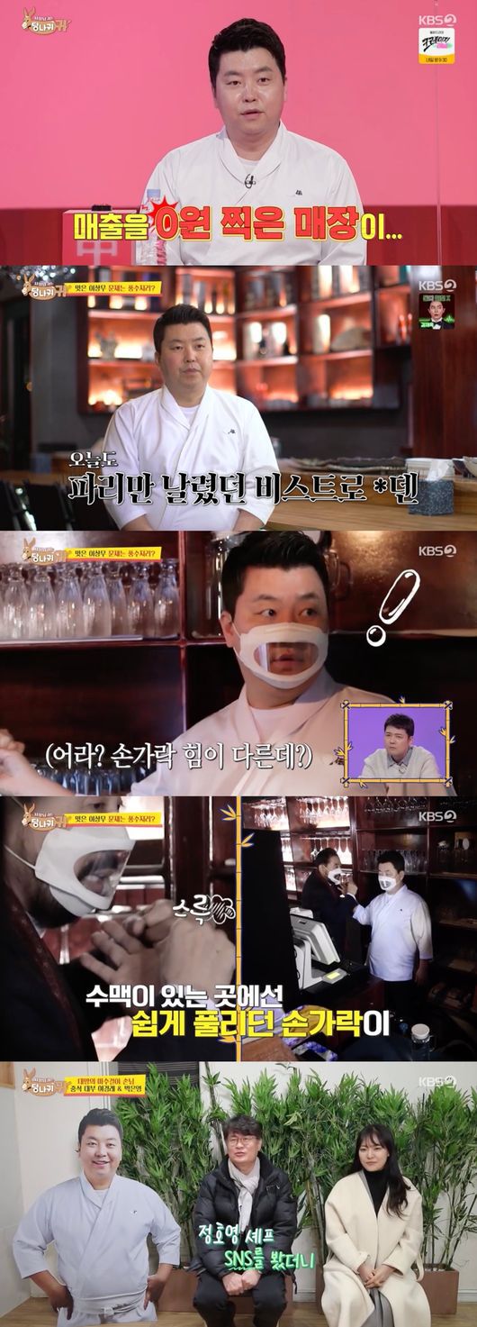 미슐랭이 인정한 일식 장인 정호영이 선보이는 환상적인 맛과 비주얼의 향연에 여경래, 박은영 셰프는 연신 감탄사를 연발했다. 하지만 중식 대가가 극찬한 맛에도 불구하고 최근 하루 손님이 0팀인 날이 있을 정도로 장사가 되지 않아 정호영은 폐업까지 고려하고 있다고 전했다.