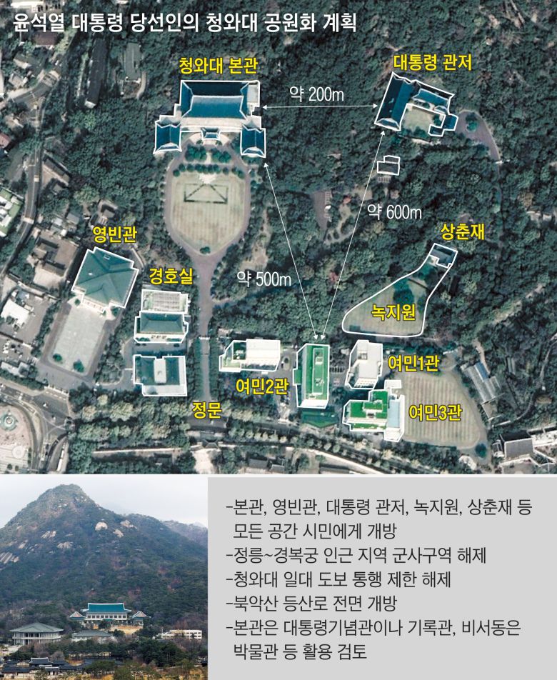 하지만 윤석열 당선인이 집무실 이전을 발표한 후 대통령직인수위원회는 자료를 통해 “청와대의 100%를 국민 품으로 돌려 드릴 것”이라며 “최고의 정원으로 불리는 상춘재 녹지원, 청와대 본관 등 청와대 부지뿐만 아니라 북악산 등산로, 서울 성곽 산책로, 광화문 광장 일대 전체가 국민에게 온전히 환원된다”고 했다. 그러면서 “정릉부터 경복궁 인근 등 강북 지역 군사구역 해제로 주민 편의가 증진되고 더 살기 좋은 강북으로 부가가치가 상승할 것으로 기대된다”고 했다. 보안과 경호 때문에 설정된 청와대 인근 지역 고도 제한도 풀릴 것이란 관측도 나온다.