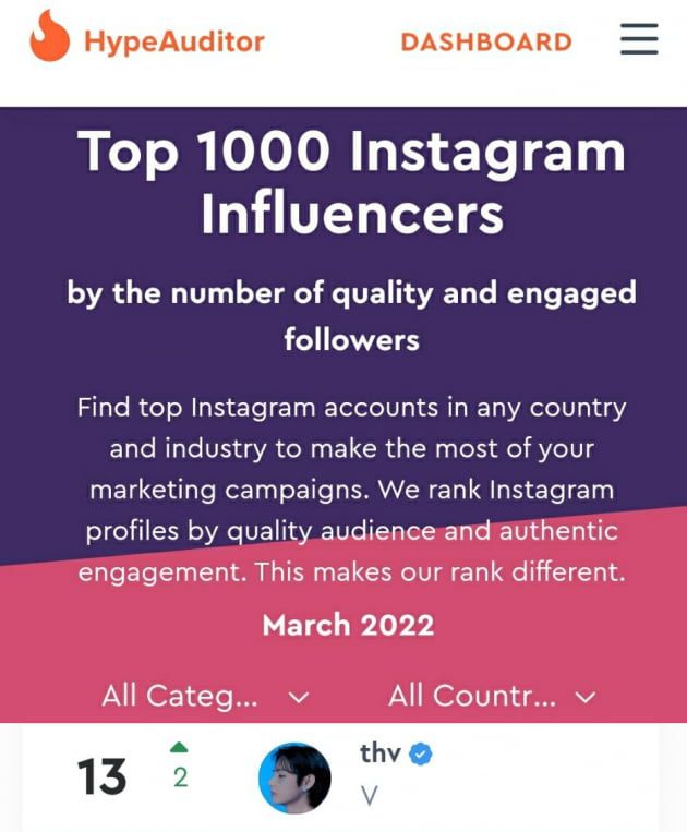 지난 15일 뷔는 인플루언서 마케팅 플랫폼 'HypeAuditor(하이프오디터)'의 'top 1000 인스타그램 인플루언서’ 랭킹에서 한국 남자 아이돌 최초로 13위를 기록했다.