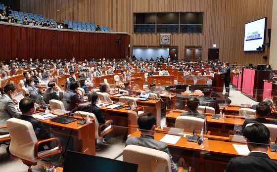 의총은 민주당 3기 원내대표 선거관리위원회 간사인 송기헌 의원의 경과보고와 투표방법에 대한 설명으로 시작했다. 이어 윤호중 민주당 공동비상대책위원장과 김영주 선관위원장의 인사말이 끝나자 비공개 투표에 들어갔다.