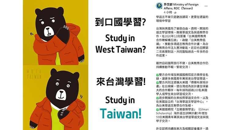 25일 대만 외교부는 페이스북을 통해 외국인에게 대만에서 중국어를 배우라는 홍보성 게시물에 이러한 표기를 했다.