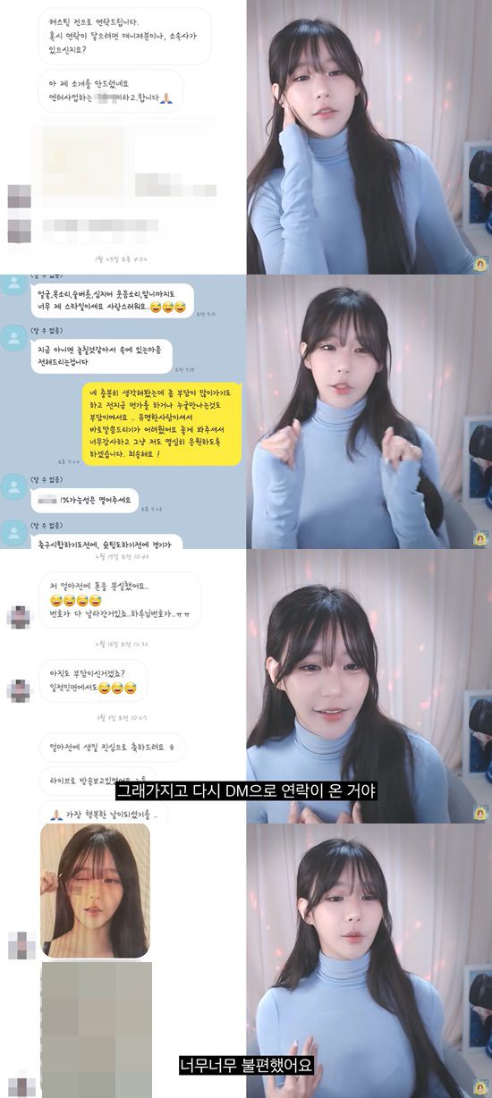 이어 "엔터 제의에 관심이 없어서 답장을 안 했는데 다른 BJ를 통해서 또 연락이 왔다. 그러더니 나한테 팬심이 있다고 만나자고 하는 거다. 부담이 돼서 거절했는데 누가 봐도 고백이라고 할 수밖에 없는 확실한 고백이었다. 좋게 끝냈다고 생각했는데 휴대전화를 잃어버렸다면서 다시 DM이 오기 시작했고 저는 답장을 하지 않았다"고 말했다.