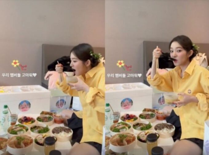 영상 속 아이린은 푸짐하게 차려진 도시락을 먹고 있다. 영상 중간 카메라를 발견한 그는 쑥스러운 듯 웃음을 터뜨렸다.