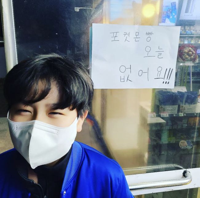 하지만 이 미소에는 씁쓸함이 담겨 있다. 가게 문 앞에서 찍은 사진인데 그 뒤로 “포켓몬 빵 오늘 없어요!”라는 메시지가 보이기 때문. 김시덕은 아들과 저녁 산책 중 요새 유행 중인 스티커를 찾으러 다니는 걸로 보인다.