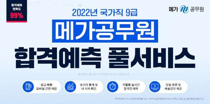 [세계비즈=황지혜 기자] 메가스터디교육은 자사 공무원시험 전문 브랜드 ‘메가공무원’을 통해 2022년 국가직 9급 공무원 공채시험이 실시되는 오는 2일, 국가직 시험 결과를 빠르게 예측할 수 있는 ‘합격예측 풀서비스’를 오픈한다고 1일 밝혔다.