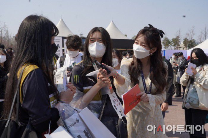 2일 경기도 고양시 킨텍스 제1전시장에서 '2022 리그 오브 레전드 챔피언스 코리아(LCK) 스프링' 결승전이 T1과 젠지의 대결로 성사된 가운데 경기에 앞서 LCK 윤수빈 아나운서가 젠지 팬들과 인터뷰를 진행하고 있다. ⓒ "젊은 파워, 모바일 넘버원 아시아투데이"이 기사의 카테고리는 언론사의 분류를 따릅니다.0공유하기