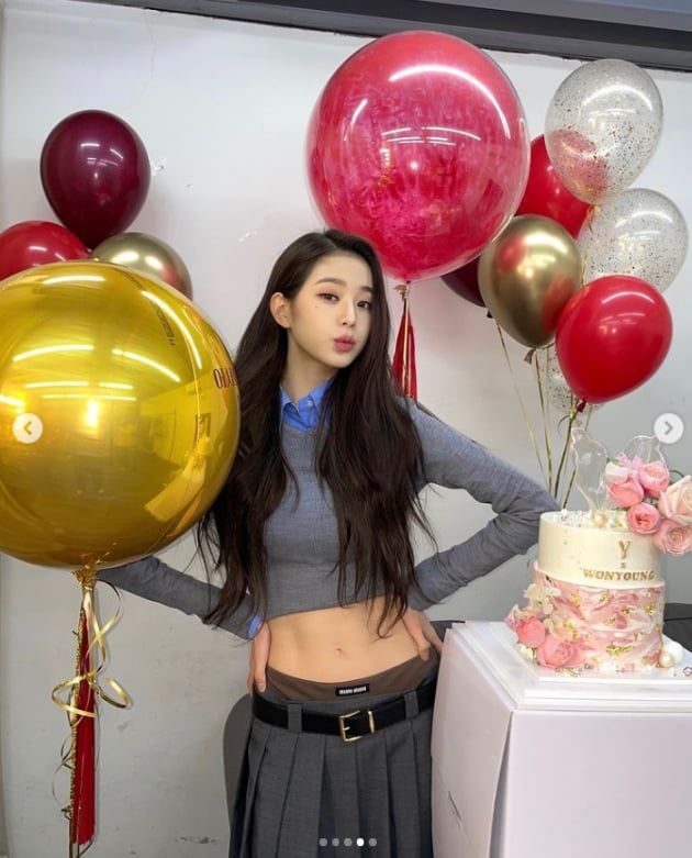 공개된 사진 속 장원영은 크롭 톱에 로우라이즈 스커트를 입고 꽃으로 장식된 케이크 옆에서 꽃받침 포즈를 취했다.