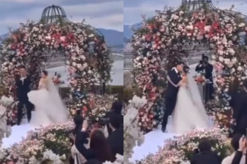 마치 영화 속 한 장면 같은 이 모습은 실제 현빈, 손예진의 결혼식 장면 중 하나. 아름다운 부부의 모습에 하객들은 뜨거운 환호를 보낸다.