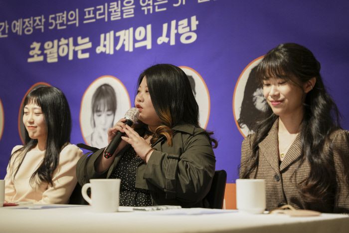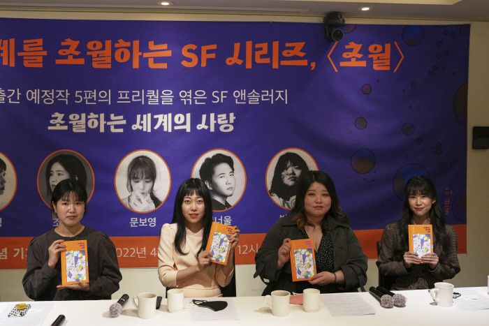 출판사 허블의 새 SF시리즈 ‘초월’의 첫 책 <초월하는 세계의 사랑> 출간에 맞춰 5일 서울 중구 달개비에서 열린 기자회견에서 참여 작가들이 발언하고 있다. 허블 제공