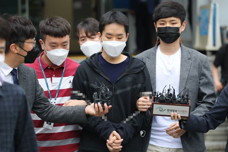 음란영상 판매 피의자 김영준이 작년 6월 종로경찰서에서 나오고 있다. 김은 여성행세를 하며 영상 통화로 촬영한 남성들의 알몸 사진 등을 인터넷에 유포한 혐의를 받고 있다. /연합뉴스