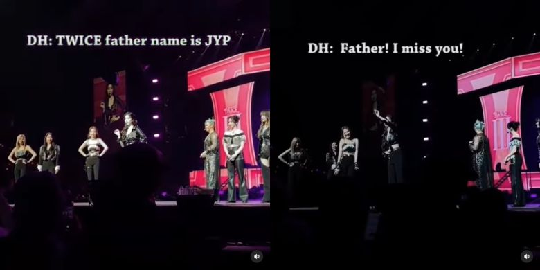 이어 다현은 3면의 관객들에게 각각 'JYP'를 나눠서 부르도록 호응했고, 연습한대로 완벽하게 호응이 나오자 "JYP가 분명 웃고 계실 것"이라며 "아빠, 저 보이세요? 아빠, 보고싶어요"라고 말하며 손을 흔들었다.
