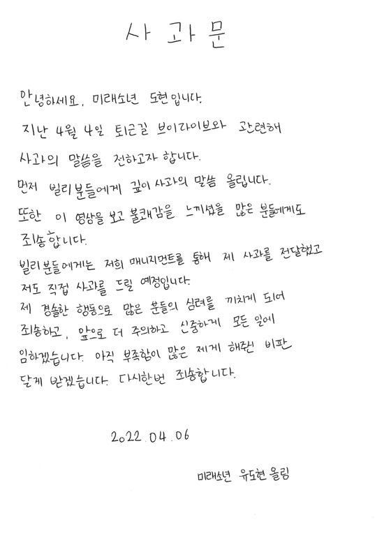 6일 미래소년 공식 SNS에는 유도현이 직접 작성한 사과문이 게재됐다. 유도현은 "빌리분들에게 깊이 사과의 말씀을 올린다. 또한 이 영상을 보고 불쾌감을 느끼셨을 많은 분들에게도 죄송하다"고 고개를 숙였다.