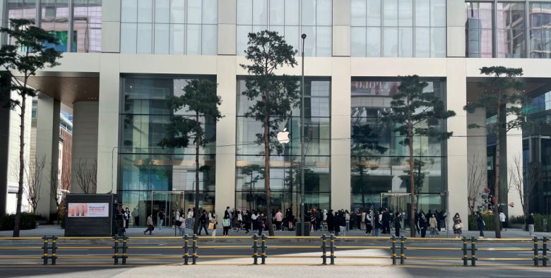 7일 '애플 명동' 앞 모습. 이날 애플 세션에 참여하는 케이팝 그룹 '세븐틴'을 보기 위해 많은 사람들이 줄을 서 있다. |
