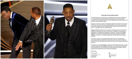 AMPAS 측은 "이사회는 윌 스미스의 행동에 대해 가장 잘 대처할 수 있는 방법과 그의 사임을 수락하는 방안을 논의하기 위해 회의를 소집했다. 그 결과 '윌 스미스는 2022년 4월 8일부터 10년 동안 아카데미시상식 본식은 물론, 추가적으로 진행되는 아카데미 관련 행사와 온라인 행사에도 참석할 수 없다'는 결정을 내렸다"고 알렸다.