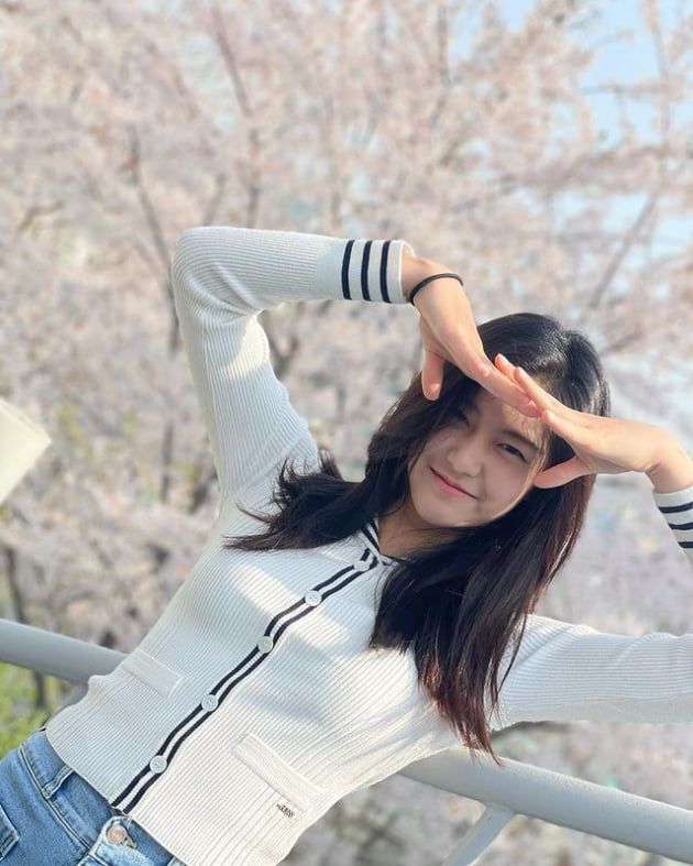 송지아는 9일 자신의 인스타그램에 "눈부셔 >_<"라는 글과 함께 두 장의 사진을 게재했다. 공개된 사진 속 송지아는 벚꽃을 배경으로 사진을 찍고 있는 모습이다.