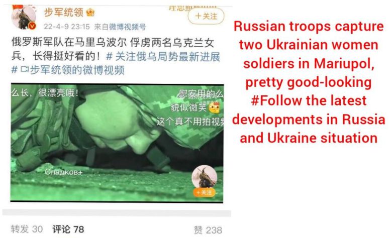 중국 소셜미디어(SNS)에 올려진 ‘러시아군에 붙잡힌 우크라이나 여군 포로’ 관련 게시물을 ‘대번역운동’ 활동가들이 영어로 번역해 자신들의 트위터 계정에 올린 화면. 화면 캡처 |