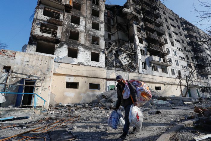 러시아군 폭격으로 무참히 파괴된 우크라이나 남부 항구도시 마리우폴의 아파트에서 지난달 28일(현지시간) 한 남성이 가재도구를 챙겨 나오고 있다. 로이터 연합뉴스 |