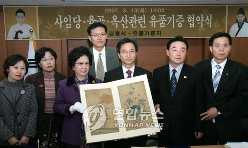 신사임당 가족 유품 강릉 '귀향'(강릉=연합뉴스) 유형재 기자 = 사임당(師任堂)과 율곡(栗谷) 이이(李珥) 가족 유품의 일부가 고향인 강원도 강릉에 돌아 오게 됐다. 강릉시는 13일 강릉시청 상황실에서 율곡의 아우이며 사임당의 아들인 조선중기의 유명 서화가 옥산(玉山) 이우(李瑀 1542-1609)의 16세 종손인 서울대 경제학부 이창용(46)교수와 신사임당 화첩 등 신사임당 가족 유품 397점을 기증 받는 협약식을 체결했다. 화첩을 들고 있는 사람은 옥산의 15세 종부 윤양호씨, 이창용 교수, 최명희 강릉시장(왼쪽부터) 2007.3.13 yoo21@yna.co.kr