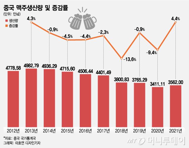 지난해가 되어서야 비로소 중국 맥주생산량은 4.4% 늘어난 3562만㎘를 기록하며 반등하기 시작했다. 지난해 중국 맥주생산량인 3562만㎘만해도 14억인구가 1인당 약 25리터씩 마실 수 있는 양이다.