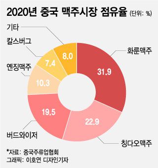 2020년 중국 맥주시장에서 화룬맥주, 칭다오맥주, 버드와이저, 옌징맥주, 칼스버그 등 상위 5개사의 점유율 합계는 92%를 기록했다. 화룬맥주의 점유율이 31.9%로 1위를 차지했으며 2위는 칭다오맥주(22.9%)가 차지했다. 3~5위는 버드와이저(19.5%), 옌징맥주(10.3%), 칼스버그(7.4%)다.