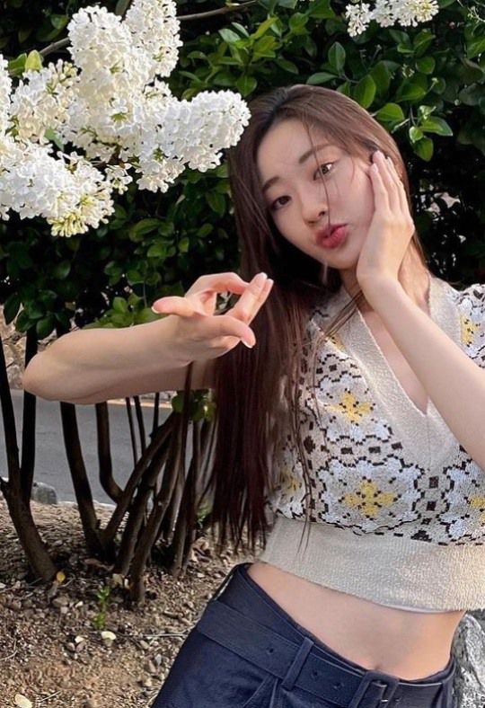 공개된 사진 속 경리는 꽃나들이를 즐기고 있다. 그는 크롭 니트를 입고 잘록한 허리라인을 자랑하고 있다. 군살 하나 없이 늘씬한 자태는 감탄을 자아낸다.