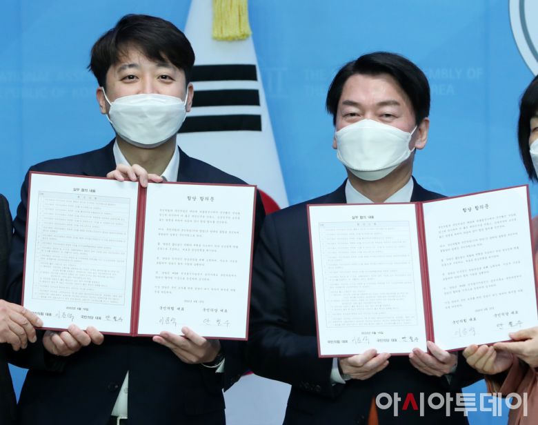 아시아투데이 이병화 기자 = 이준석 국민의힘 대표와 안철수 국민의당 대표가 18일 국회 소통관에서 기자회견을 열고 합당을 선언한 뒤 합의문을 들어보이고 있다. ⓒ "젊은 파워, 모바일 넘버원 아시아투데이"이 기사의 카테고리는 언론사의 분류를 따릅니다.0공유하기