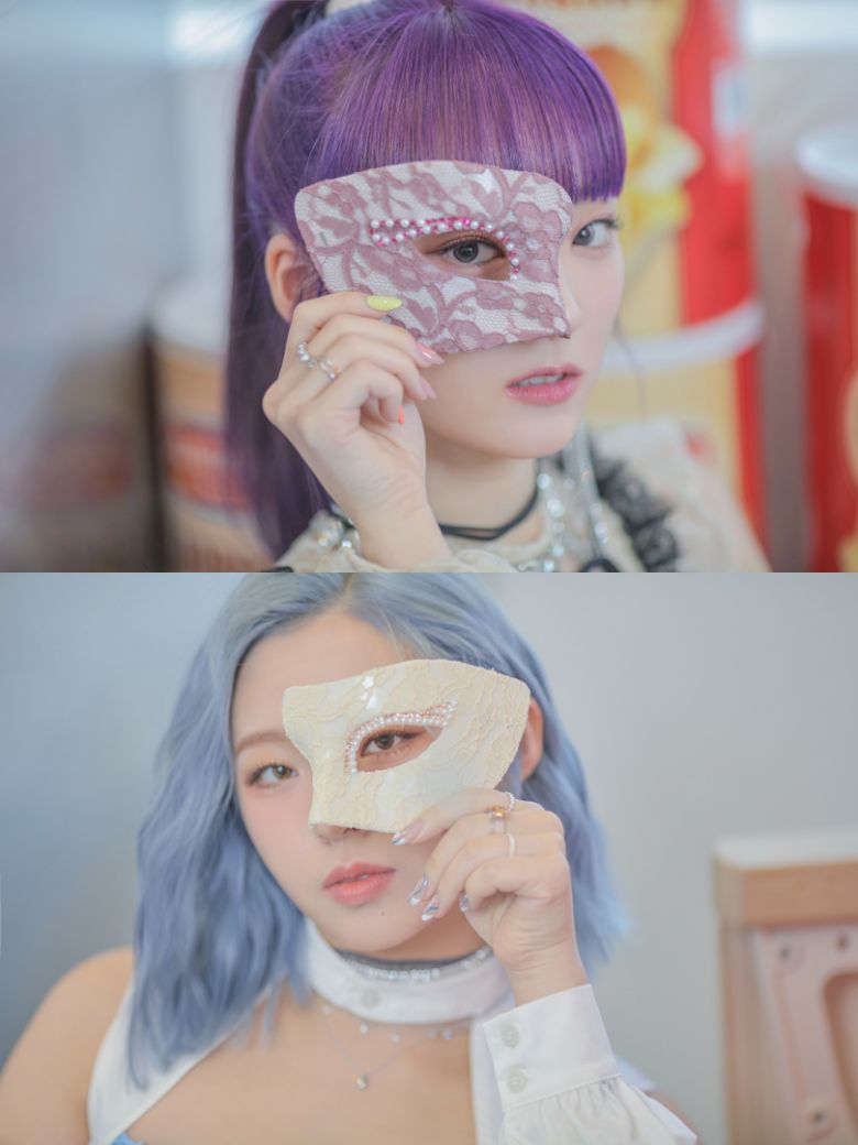 공개된 이미지 속 이지 씨와 채린 씨는 반짝이는 비즈로 장식된 가면으로 한쪽 눈을 가린 모습이다. 화려한 액세서리와 보라색, 푸른색 헤어스타일은 신비로운 무드를 더욱 배가시키며 새 앨범 콘셉트에 대한 궁금증을 자극했다.