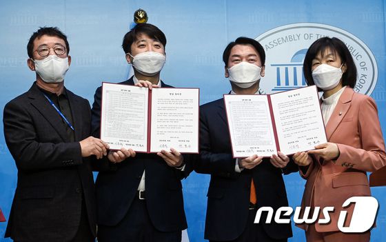 (서울=뉴스1) 유승관 기자 = 이준석 국민의힘 대표와 안철수 국민의당 대표가 18일 서울 여의도 국회 소통관에서 합당을 선언한 뒤 합의문을 들어보이고 있다. 왼쪽부터 홍철호 국민의힘 전략기획부총장, 이 대표, 안 대표, 최연숙 국민의당 사무총장. (공동취재) 2022.4.18/뉴스1fotogyoo@news1.kr[© 뉴스1코리아(news1.kr), 무단 전재 및 재배포 금지]이 기사의 카테고리는 언론사의 분류를 따릅니다.0공유하기