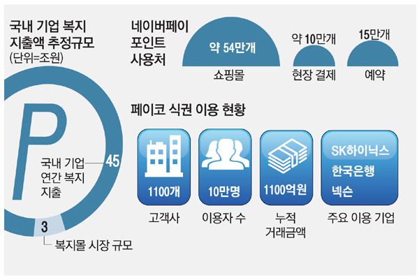 네이버파이낸셜(네이버페이), 페이코 등 간편결제로 시장 혁신을 주도했던 핀테크 기업들이 기업 복지 시장에도 새바람을 일으키고 있다. 이들은 수십만 곳에 달하는 방대한 사용처와 이용의 편리함을 무기로 사내 복지 포인트와 식대 등을 자사 포인트(선불충전금)로 대체하고 있다. 업계에서는 복지몰 시장을 최소 수조 원에서 10조원 규모로 추정한다.