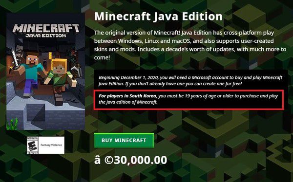 한국 게이머는 19세 이상만 마인크래프트 자바 에디션을 구매하고 플레이할 수 있었다. / 사진=마인크래프트 홈페이지 |