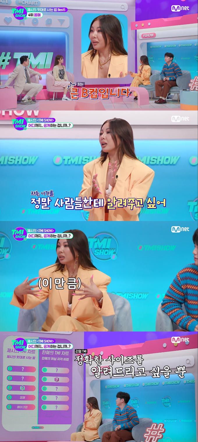 남다른 볼륨감으로도 화제를 모은 제시는 이날 방송에서 "여기는 'TMI SHOW'니까 사람들에게 꼭 말해주고 싶은 게, 나는 정말 큰 B컵"이라고 밝혔다.