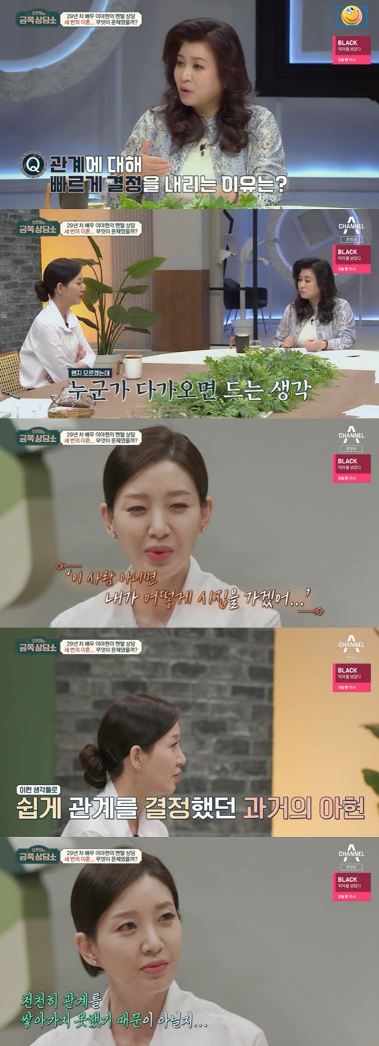 오은영은 심도 있는 상담을 위해 배우자에 대해 물었다. 세 번의 결혼과 세 번의 이혼을 겪은 이아현은 "배우자가 지금은 없다. 힘들었기 때문에 안 좋은 결과가 나왔을 것. 쉽게 좋은 사람이라고 결정 내리고 쉽게 인연을 정리했다. 그로 인해 후회하는 일이 많았다. 아직 반복되는 중인 것 같다. 안 그러려고 노력은 한다"고 밝혔다.