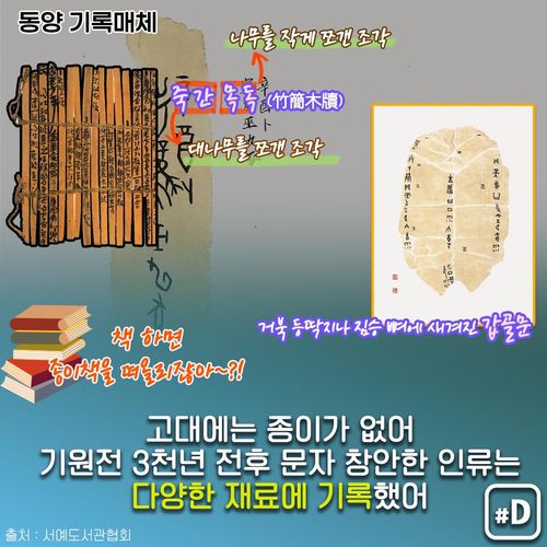 동양에선 귀갑수골(거북 등딱지와 짐승 뼈)이나 쇠붙이, 돌에 기록을 남기다가 지혜가 발달하면서 죽간목독(竹簡木牘)을 이용하게 됐습니다.